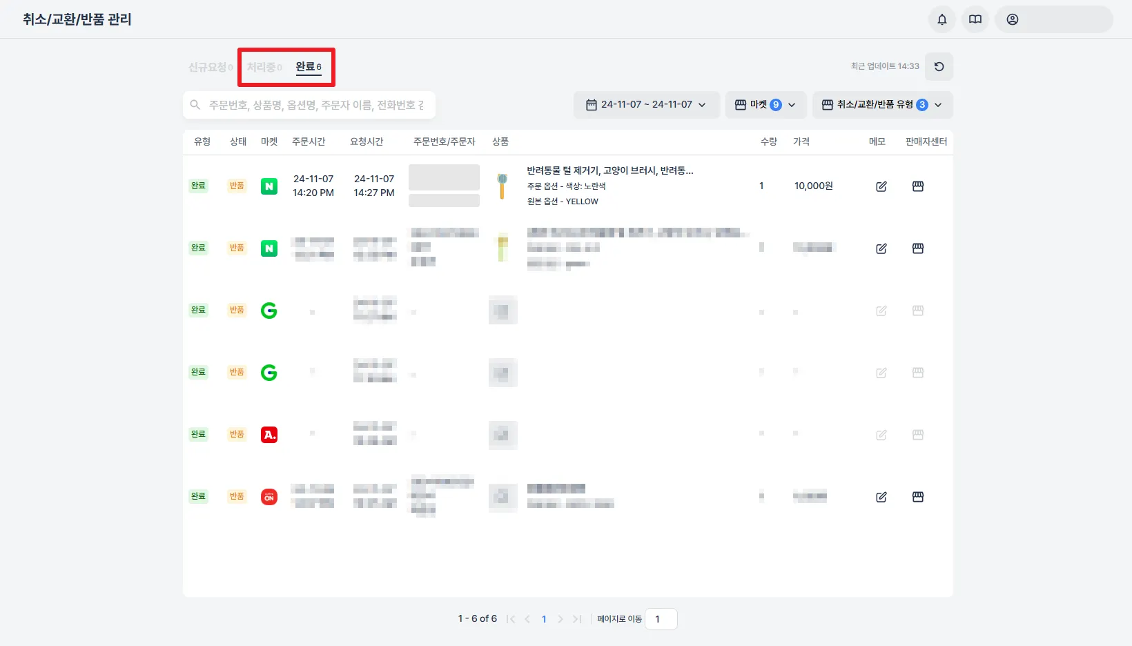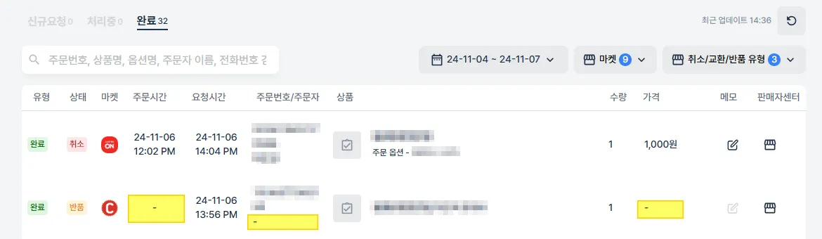 각 오픈마켓에서 취소/교환/반품 요청 건에 대한 처리를 진행해 주세요.