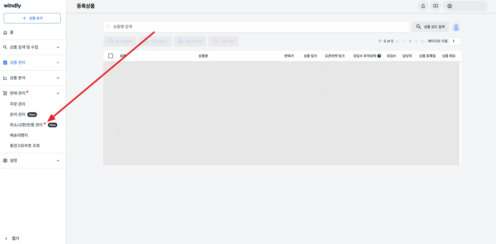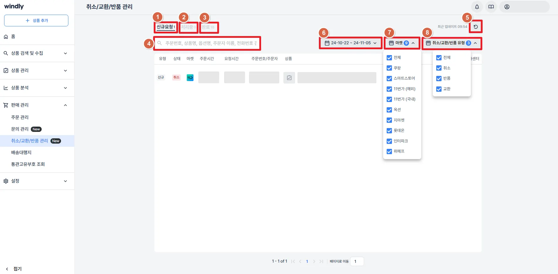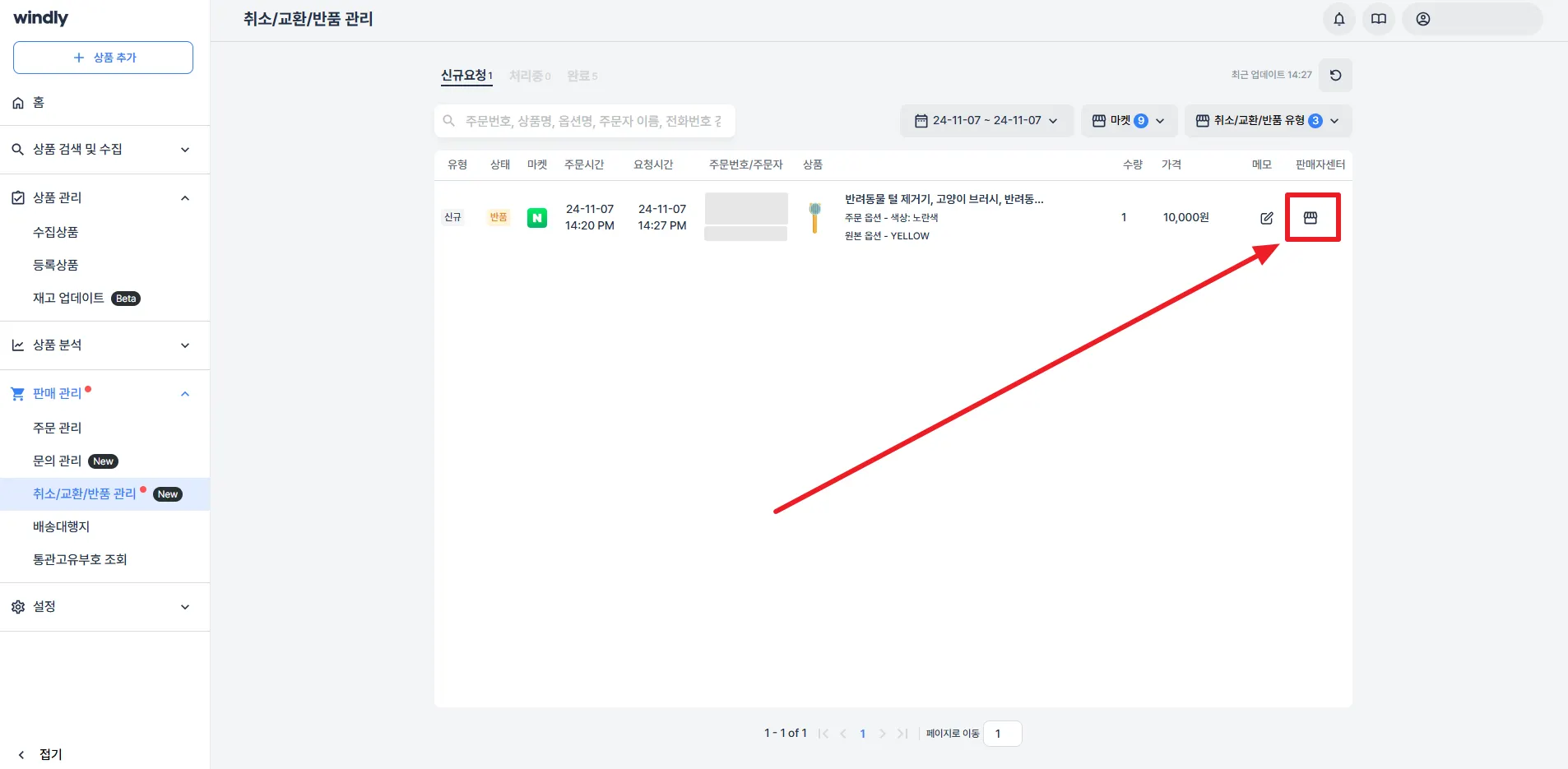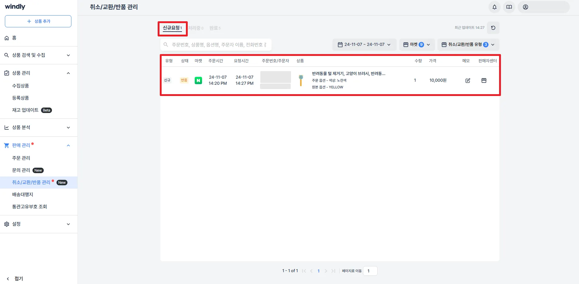새로운 취소/교환/반품 요청이 발생하면, 윈들리 좌측 메뉴 ‘취소/교환/반품 관리’에 알림이 표시되어요.
