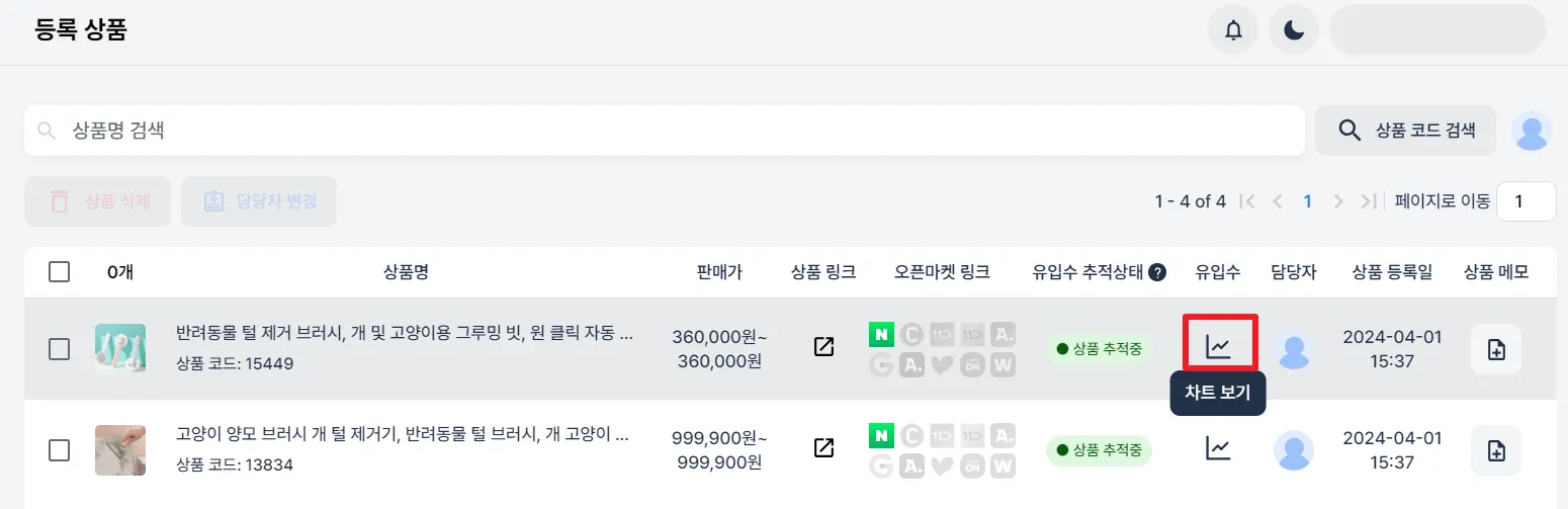 또는 등록상품 목록에서 그래프 버튼을 클릭해 주세요.