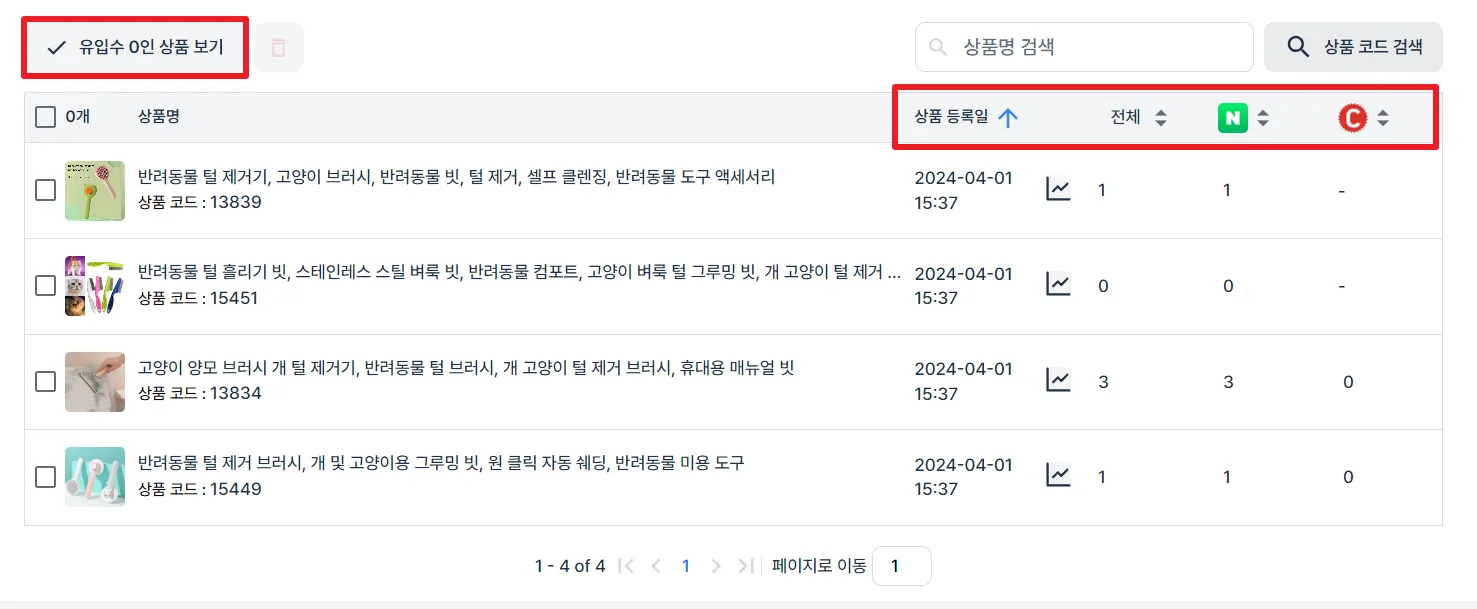 ‘유입수 0인 상품 보기’ 버튼을 클릭하여, 유입수가 없는 상품만 확인할 수도 있어요.