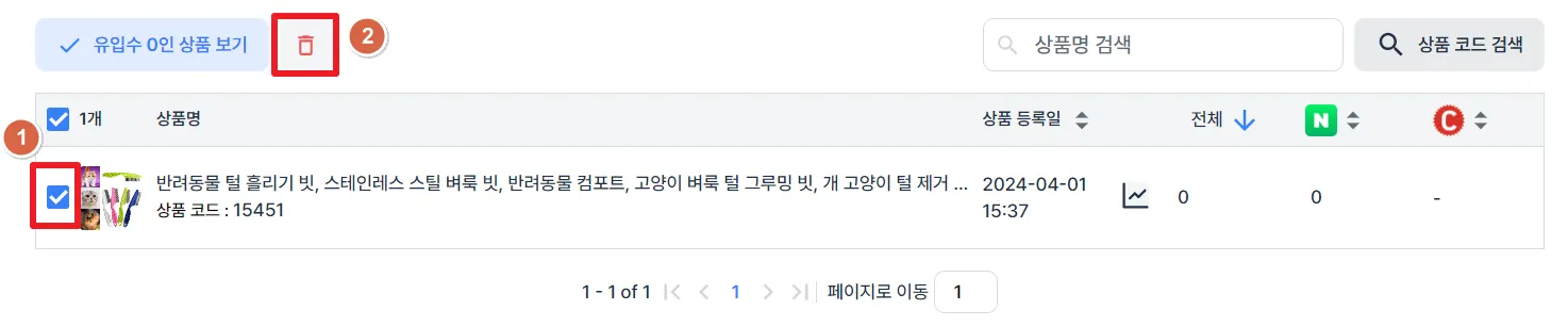유입수 0인 상품에 대해, 상품 체크 후 바로 삭제할 수 있습니다.