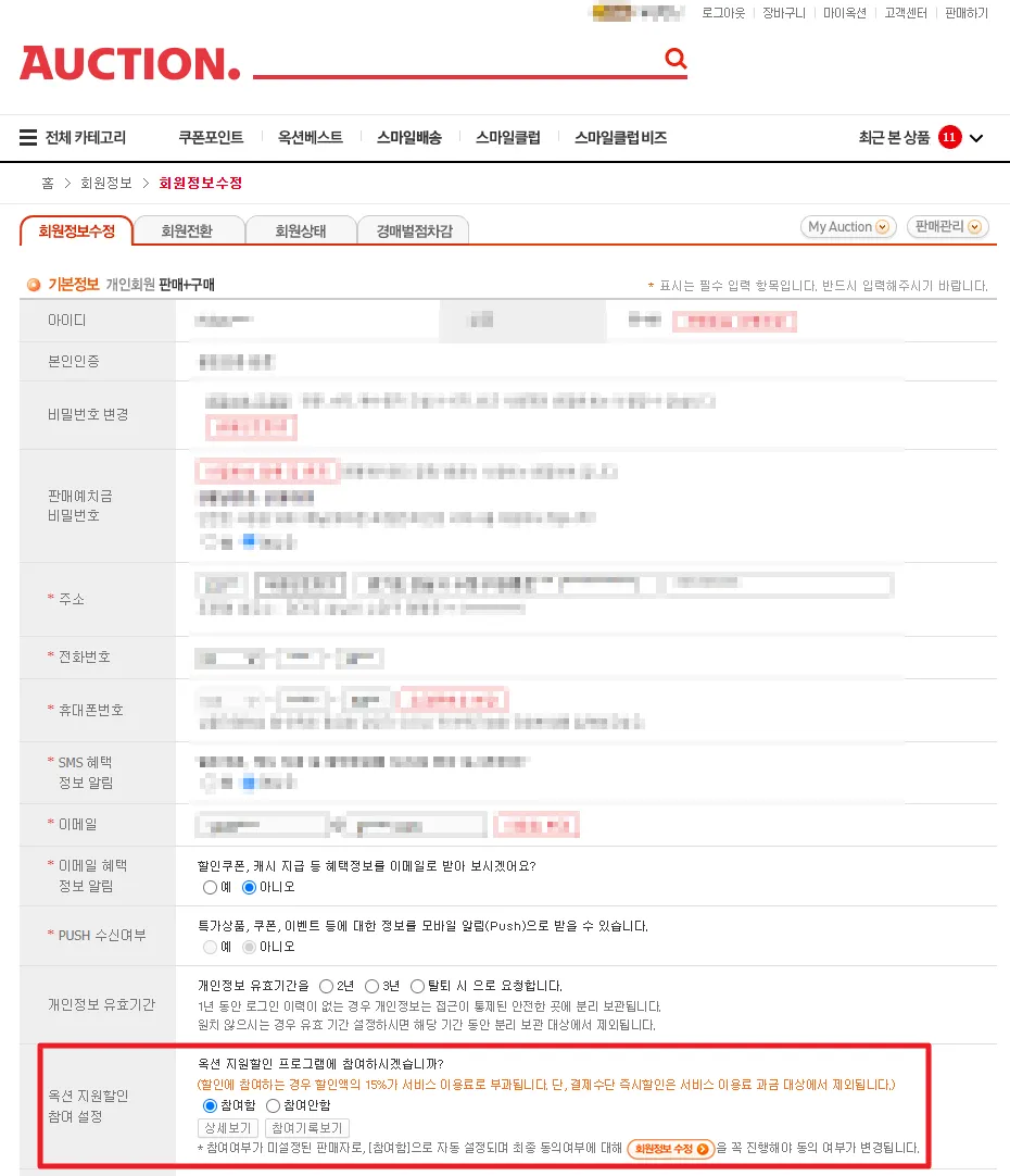 회원정보수정 > 옥션 지원할인 참여설정 > 참여함 선택