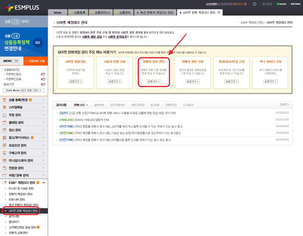 ESM+ 계정관리 > G마켓 판매 계정 관리 > 판매자 정보 관리