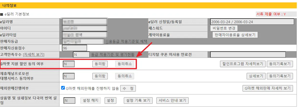 나의정보 > G마켓 지원할인 동의여부 > 동의함 선택