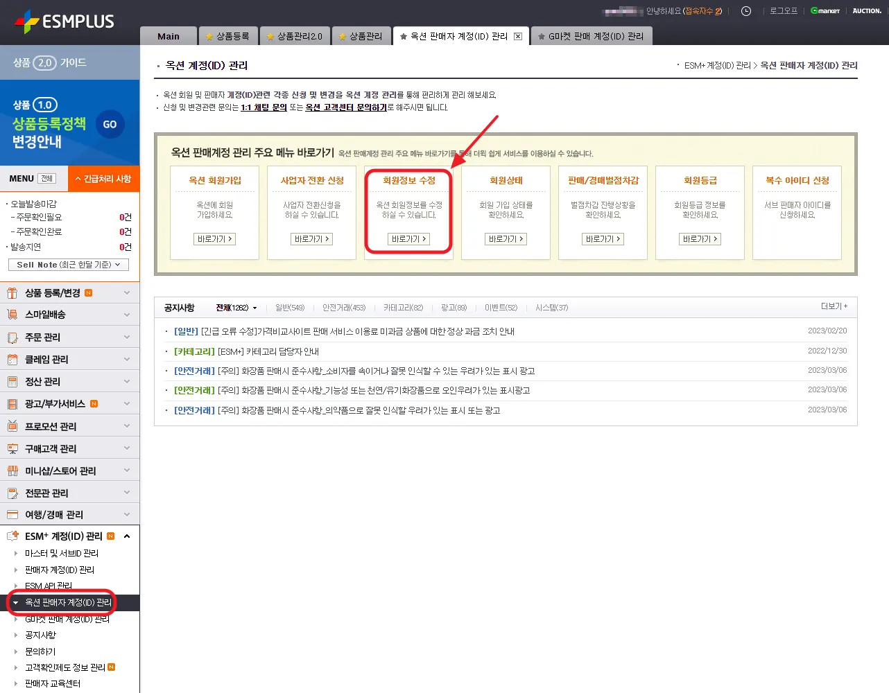 옥션 판매자 계정 관리 > 회원정보 수정 선택