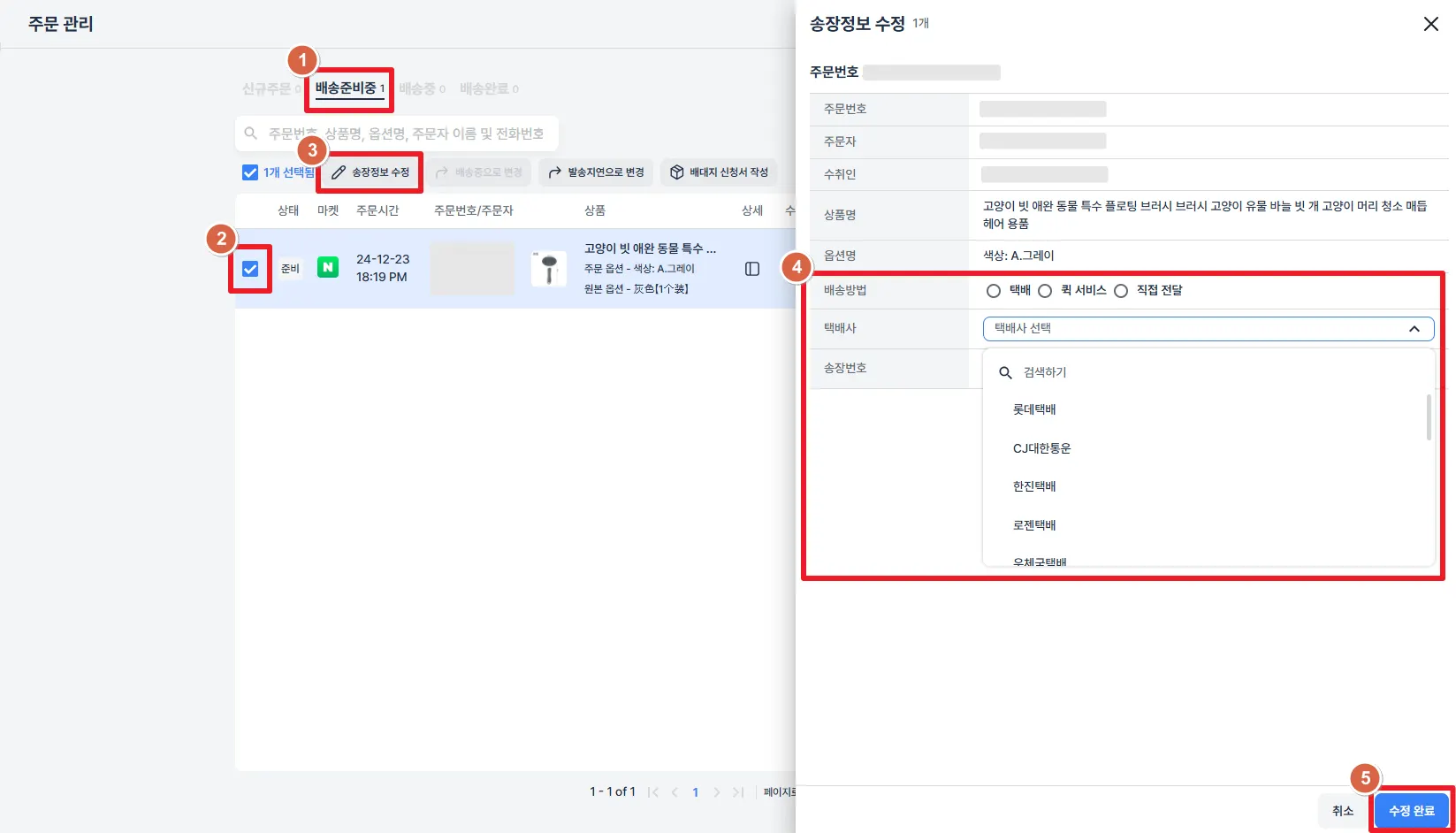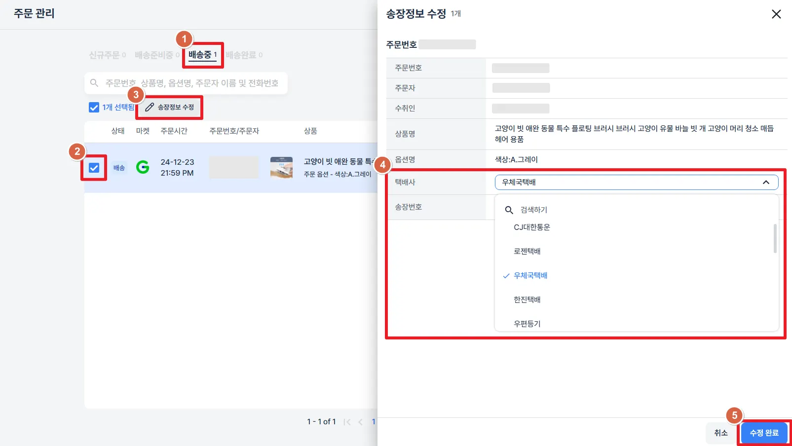 )하고 송장정보 수정 버튼을 클릭하여 아래 정보 입력 후 수정 완료 버튼을 클릭해 주세요.