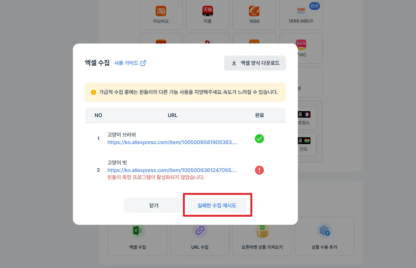 일괄 수집 시 일부 상품들은 수집 성공하고, 일부 상품들은 수집 실패했을 때, ‘실패한 수집 재시도’ 버튼이 나타나요.