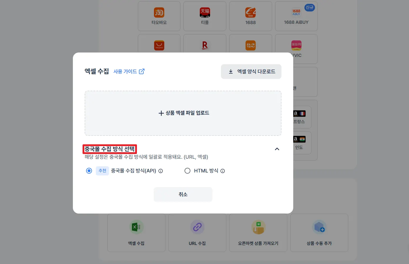 중국몰 (타오바오, 티몰, 1688) 상품을 수집할 때에는 수집 방식을 선택하여 사용할 수 있어요. 각 방식마다 장단점이 있으니, 내용을 확인하고 원하는 수집 방식을 선택하여 사용해 주세요.