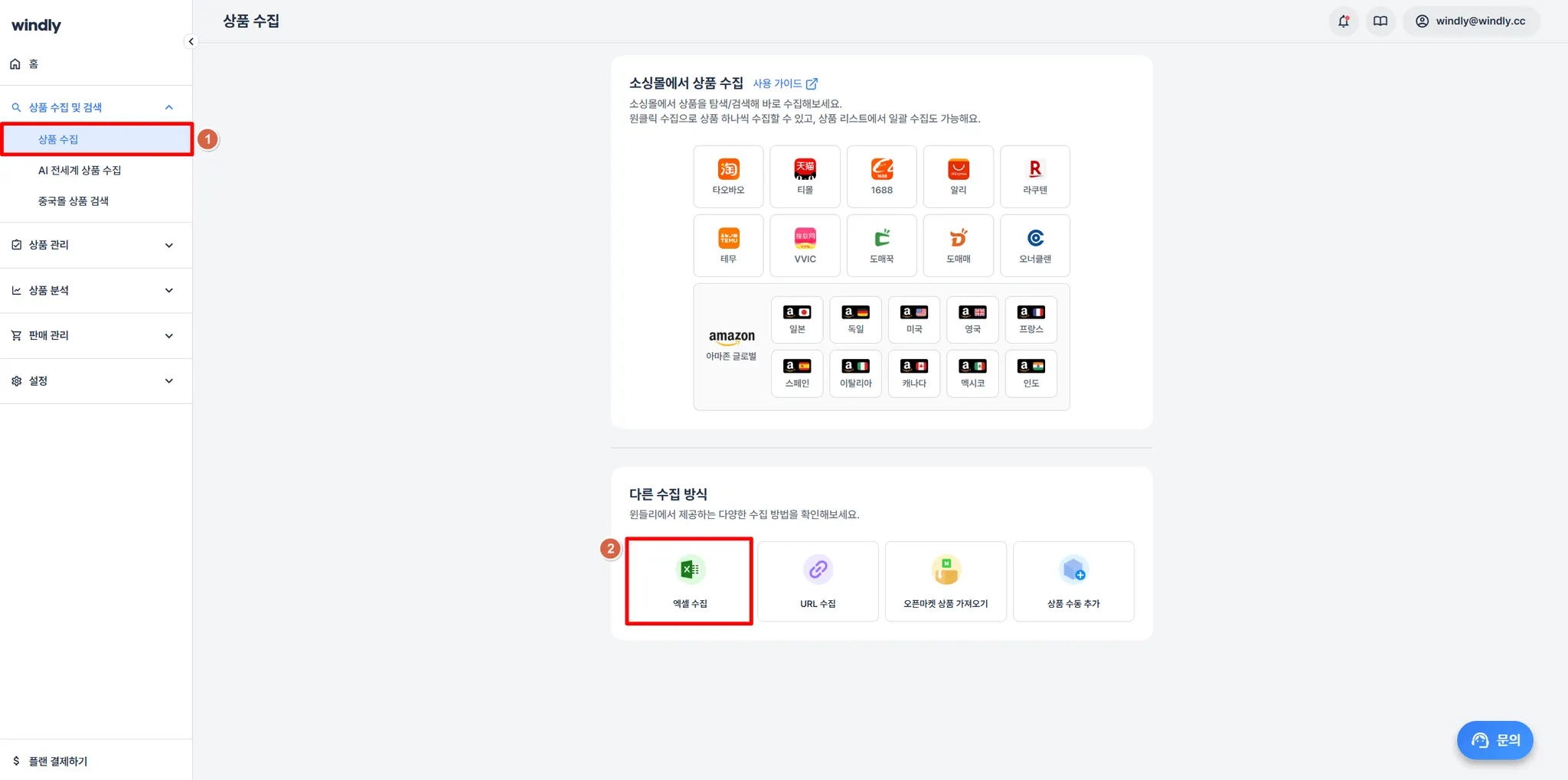 윈들리 좌측 '상품 수집 및 검색' > 상품 수집 메뉴에서 윈들리 내 가능한 모든 수집 방식을
