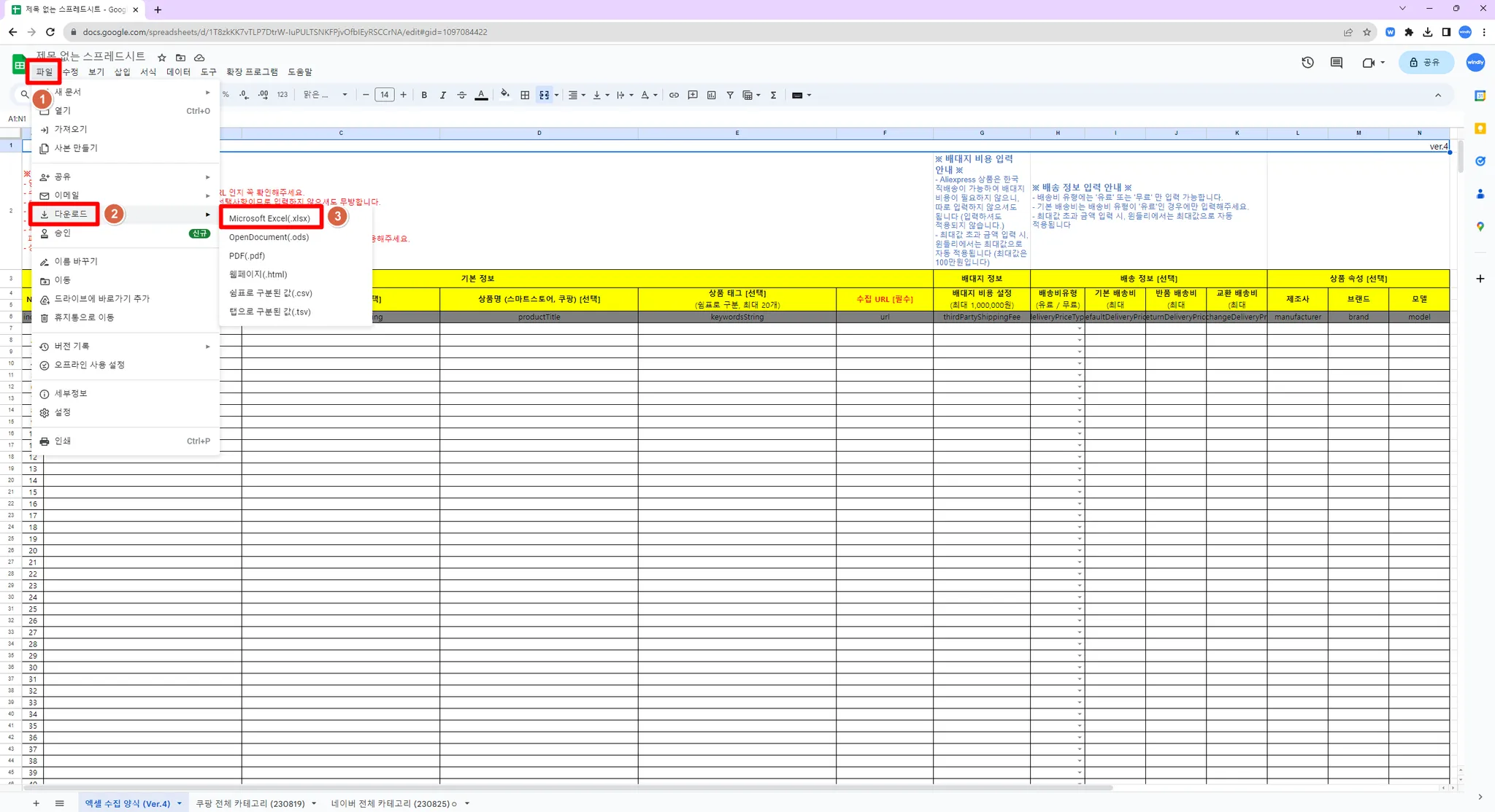 가져오기 한 양식에 수집할 상품의 정보를 입력한 후 파일 → 다운로드 → Microsoft Excel(.xlsx)을 클릭해 주세요.