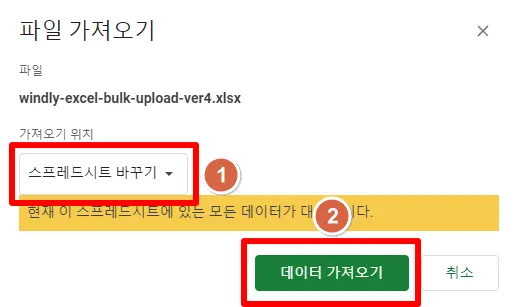 가져오기 위치 항목을 클릭하여 스프레드시트 바꾸기로 선택한 후 데이터 가져오기 버튼을 클릭해 주세요.