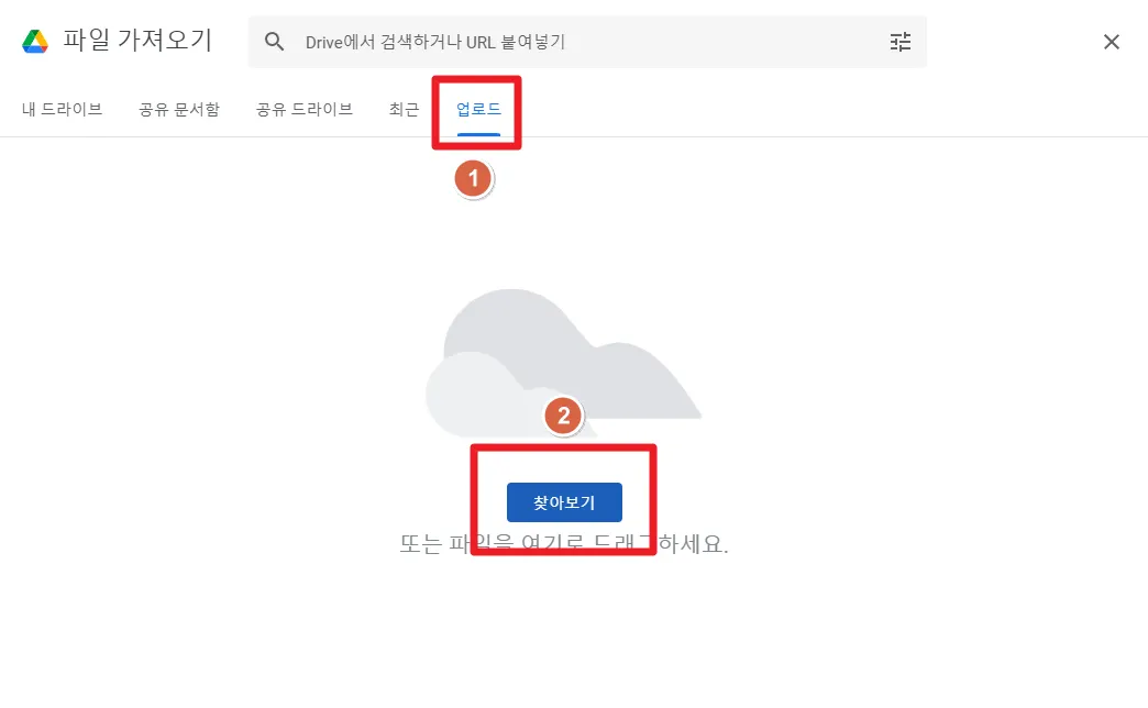 파일 가져오기 팝업창에서 업로드 탭 클릭 후 찾아보기 버튼을 클릭해 주세요.
