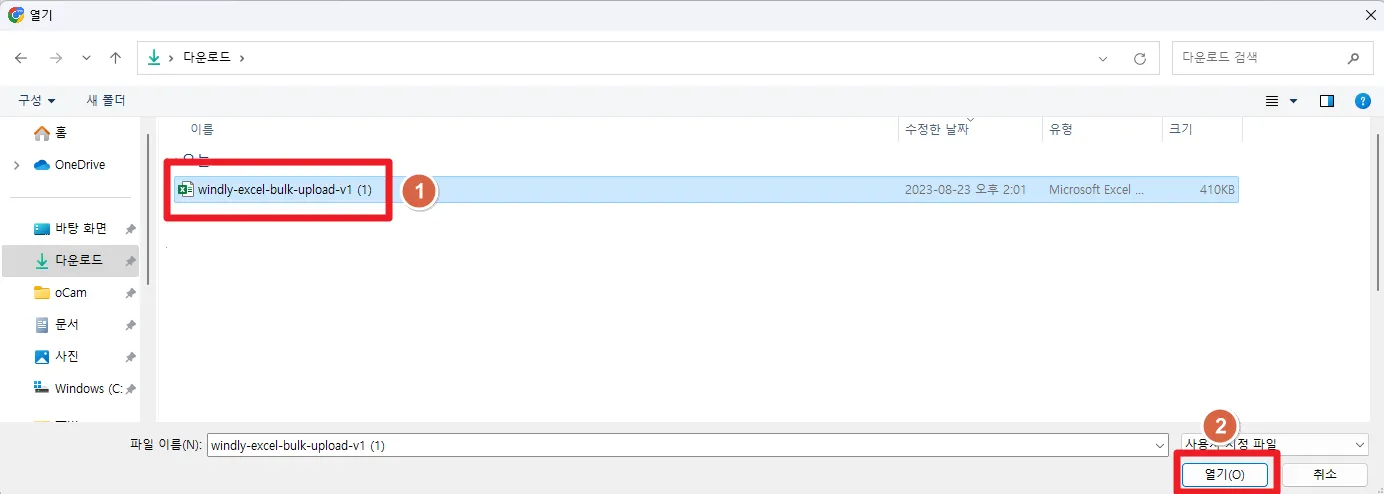 윈들리에서 다운로드 받은 엑셀 양식을 선택한 후 열기 버튼을 클릭해 주세요.