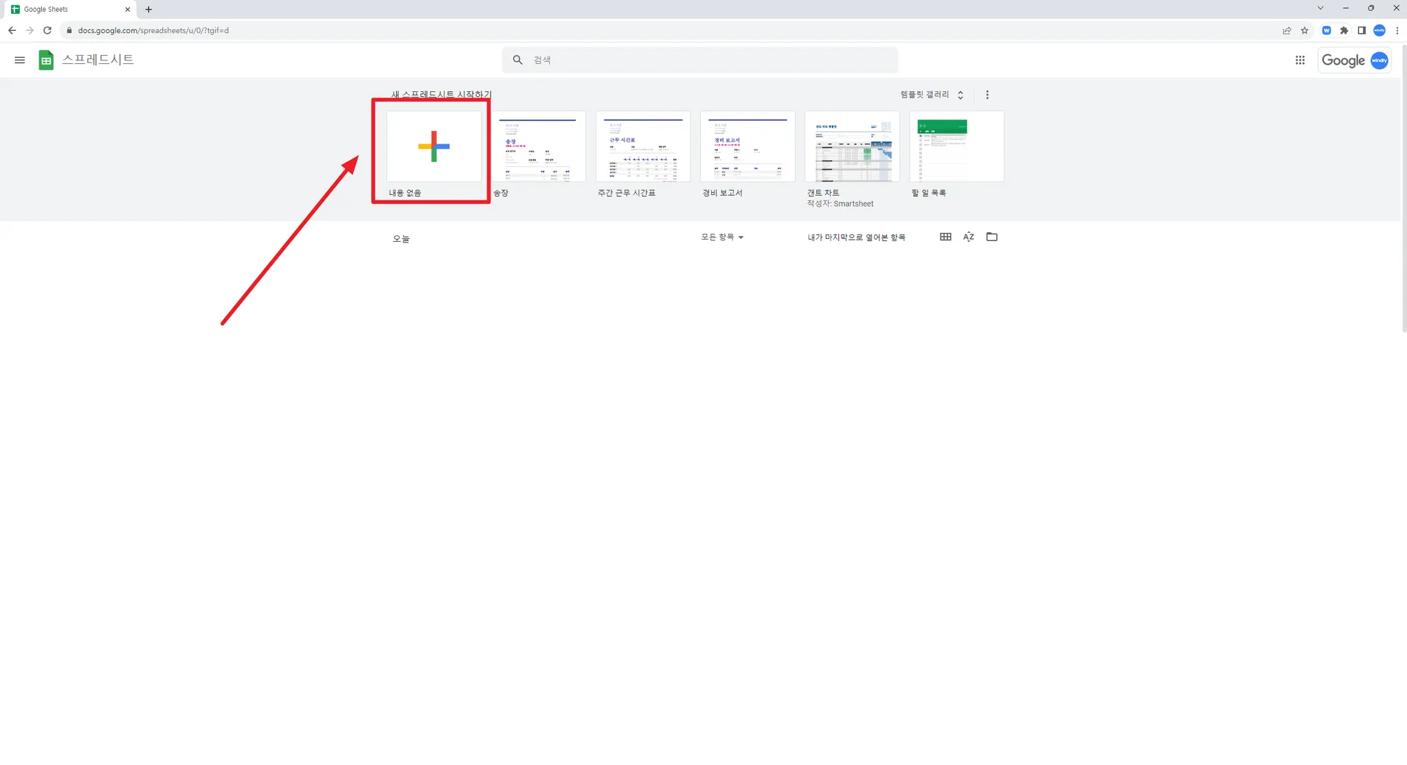 스프레드시트 페이지에서 새 스프레드시트 시작하기 아래의 내용 없음을 클릭해 주세요.