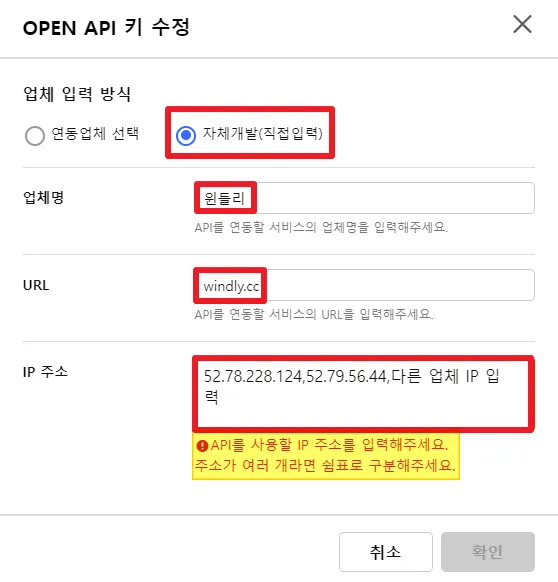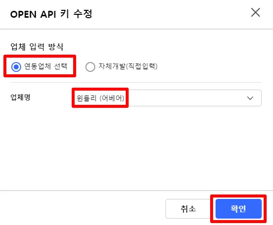 연결 설정을 완료한 후, Open API 정보를 윈들리에 입력해야 합니다.