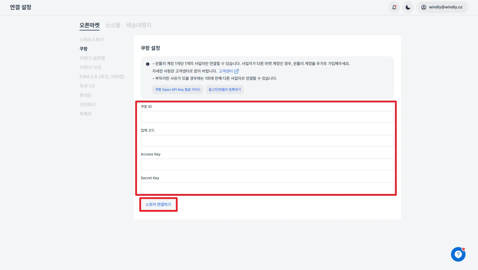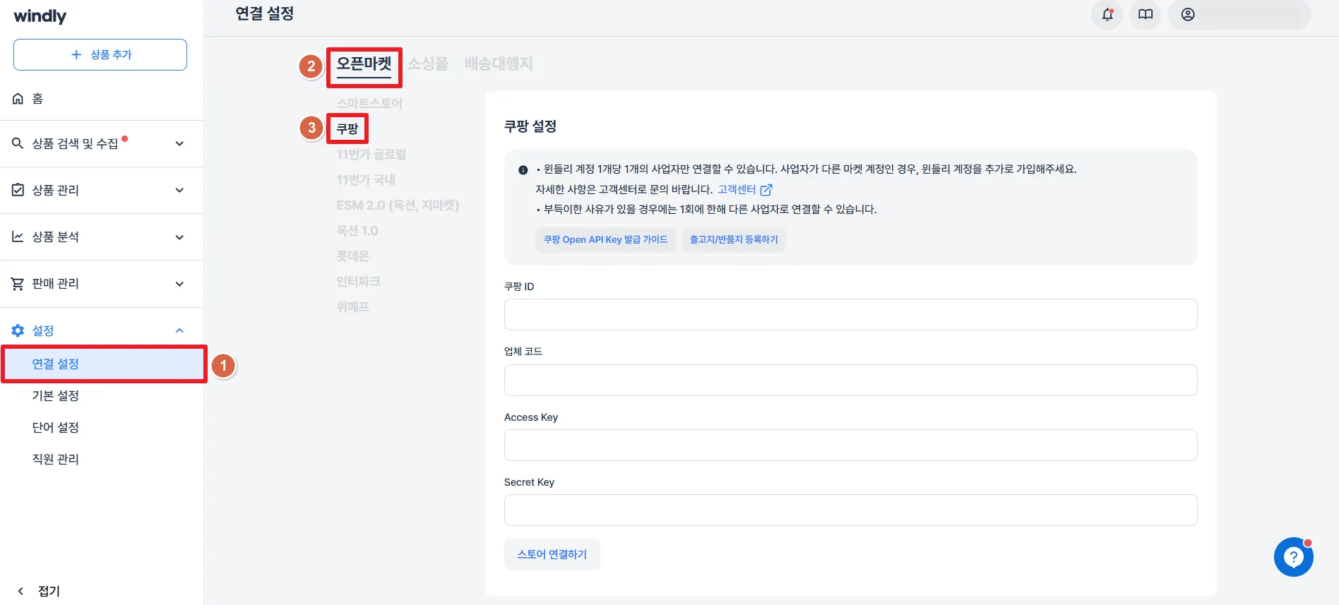 윈들리 좌측 메뉴 ‘설정’ - 연결 설정 - 오픈마켓 - 쿠팡으로 접속해 주세요.