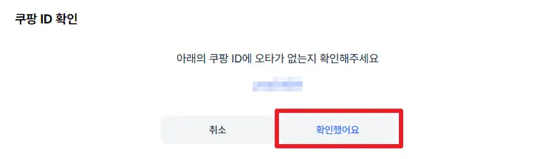 팝업창에서 쿠팡 ID를 확인한 후, 확인했어요 버튼을 클릭해 주세요.