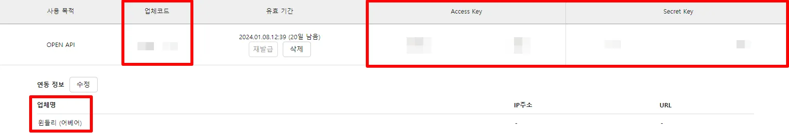 쿠팡윙에서 아래와 같이 Open API 정보 안에 업체코드, Access Key, Secret Key가 모두 적혀 있습니다.