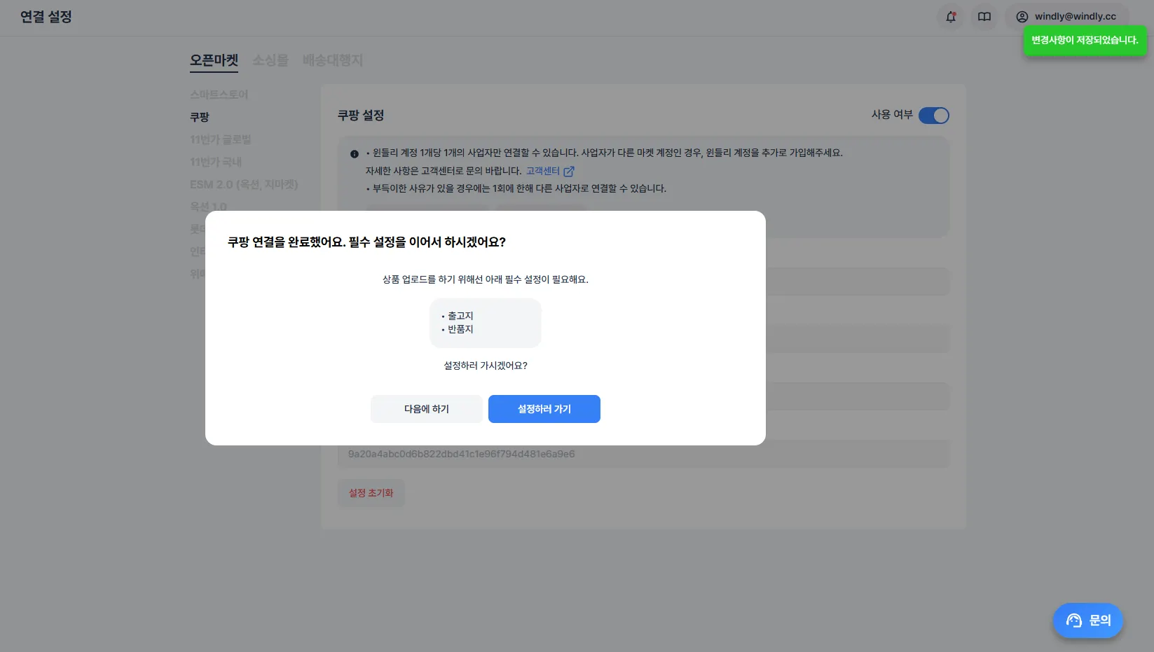 연결이 완료되면 나오는 화면에 따라, 윈들리 좌측 메뉴 ‘설정’ - 기본 설정 - 쿠팡 영역에서 쿠팡 필수 설정을 진행해 주세요.