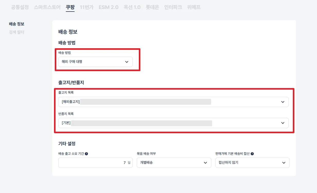 출고지와 반품지는 보통 아래와 같이 입력하는 방향을 추천 드리고 있어요.