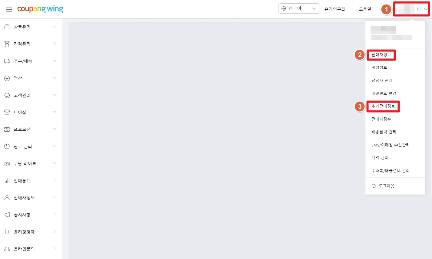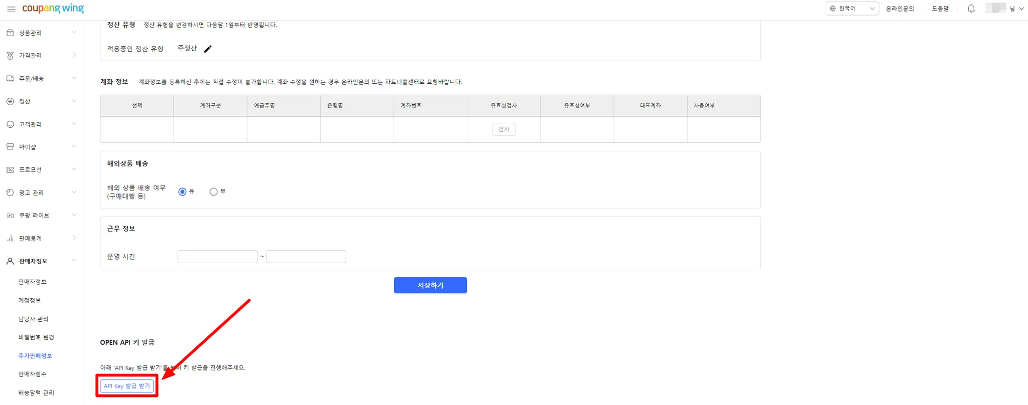 쿠팡 Wing에서 우측 상단의 본인 아이디를 클릭한 후 판매자정보 또는 추가판매정보 메뉴를 클릭해 주세요. 판매자ID에 따라 API Key 발급 메뉴 위치가 달라질 수 있습니다.