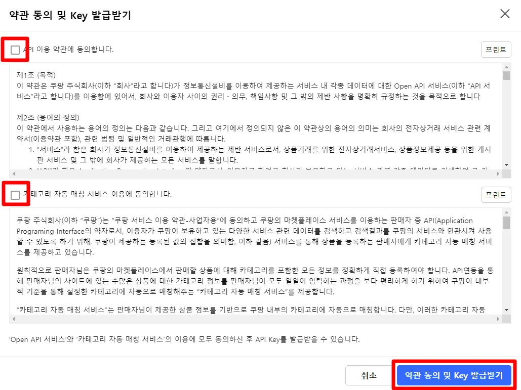 동의 항목을 체크한 후 약관 동의 및 Key 발급받기 버튼을 클릭해 주세요.