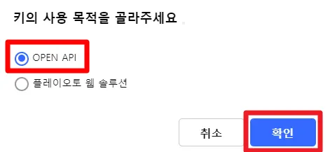 키의 사용 목적 팝업창에서 OPEN API를 선택한 후 확인 버튼을 클릭해 주세요.