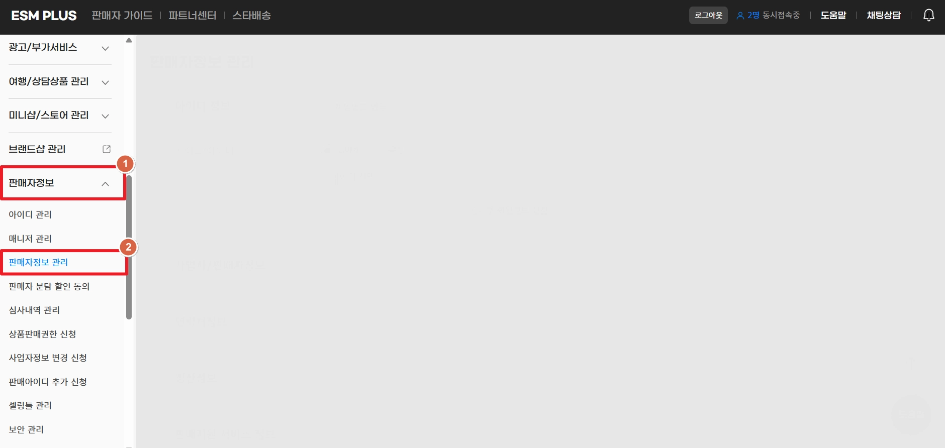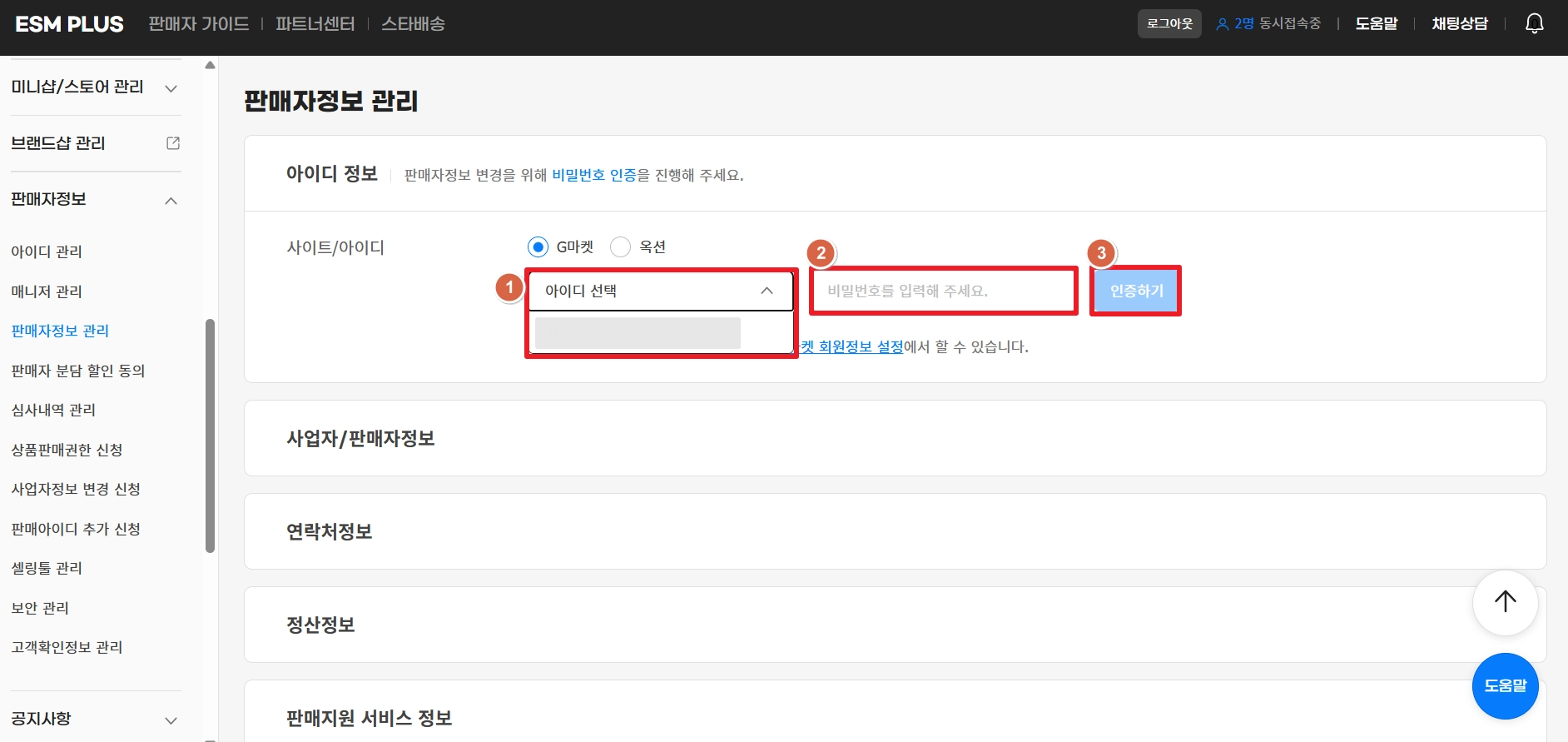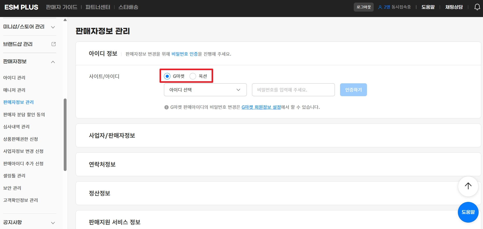 ESM PLUS 사이트에서 판매자 정보 → 판매자정보 관리로 이동해 주세요.
