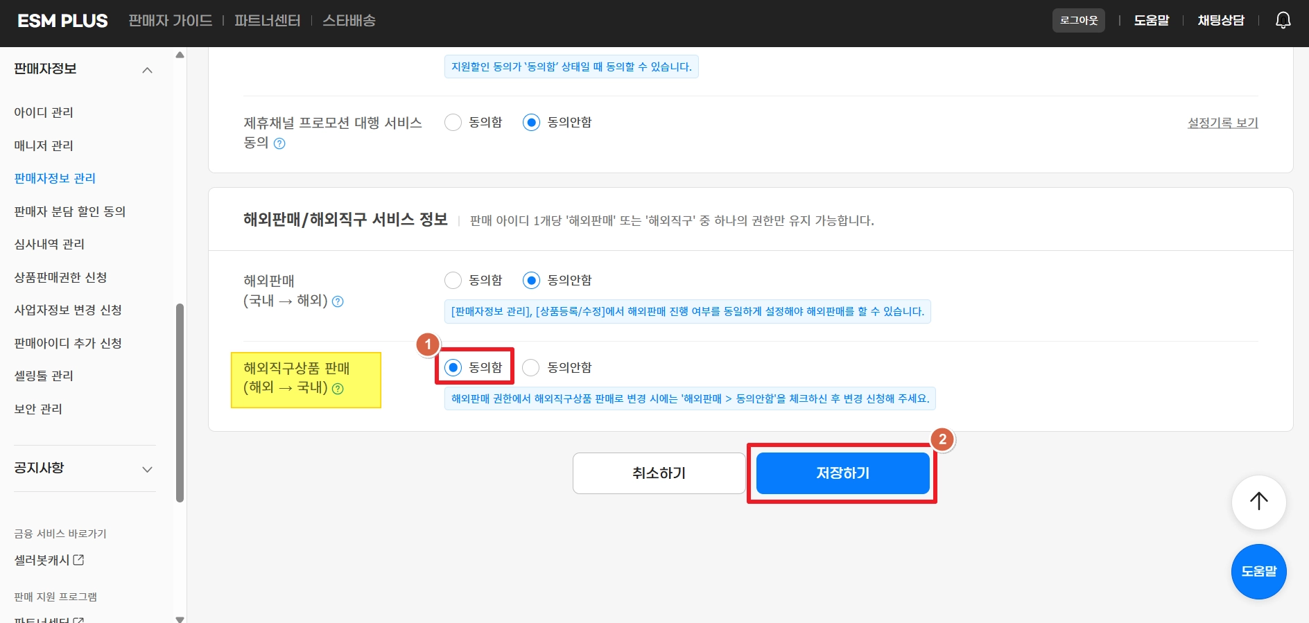 ‘해외판매/해외직구 서비스 정보’ 메뉴에서 ‘해외직구상품 판매’ 영역에 동의 후, 최하단의 저장하기 버튼을 클릭해 주세요.