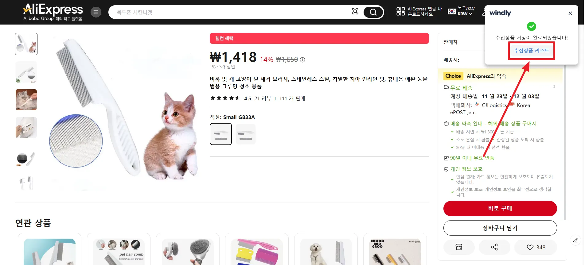 수집상품 리스트 버튼을 클릭하면 윈들리 수집상품 페이지로 즉시 이동되며, 수집완료 된 상품을 확인할 수 있어요.