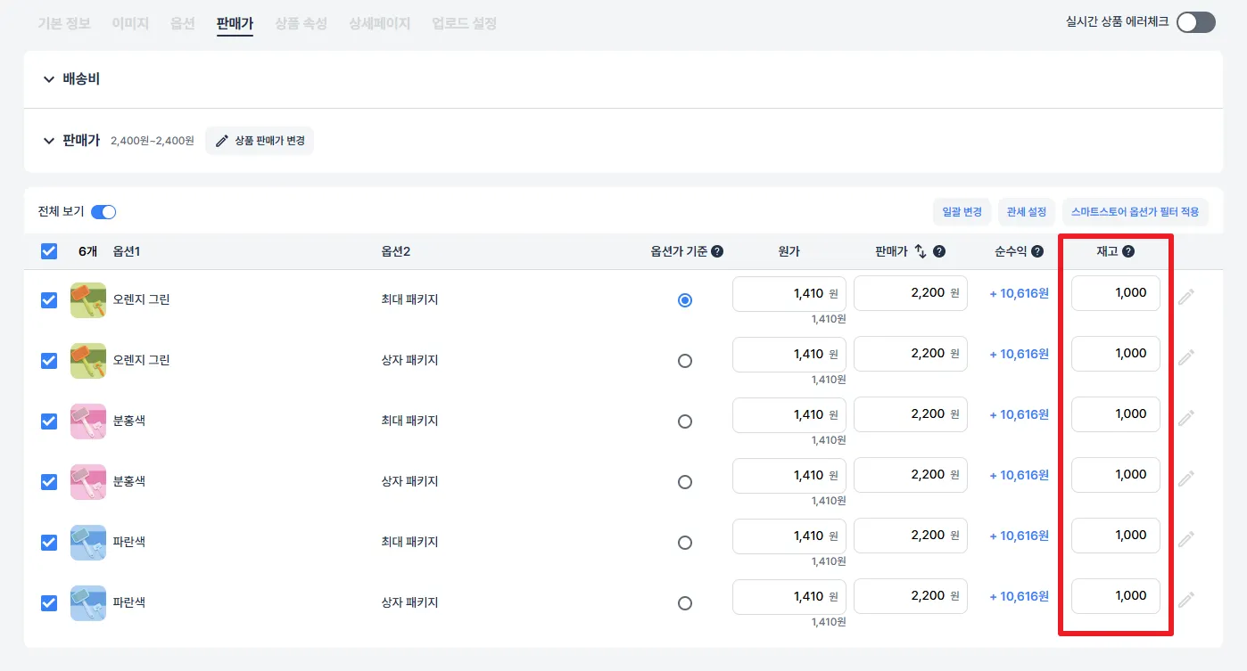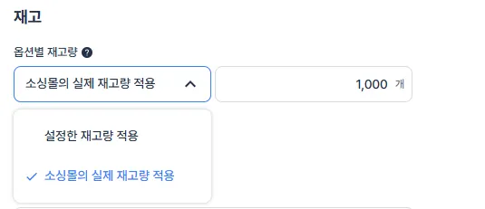 상품 수집 시, 설정하신 재고량을 적용해요. 위 이미지에서는 재고가 1,000개로 설정되어 있어요.