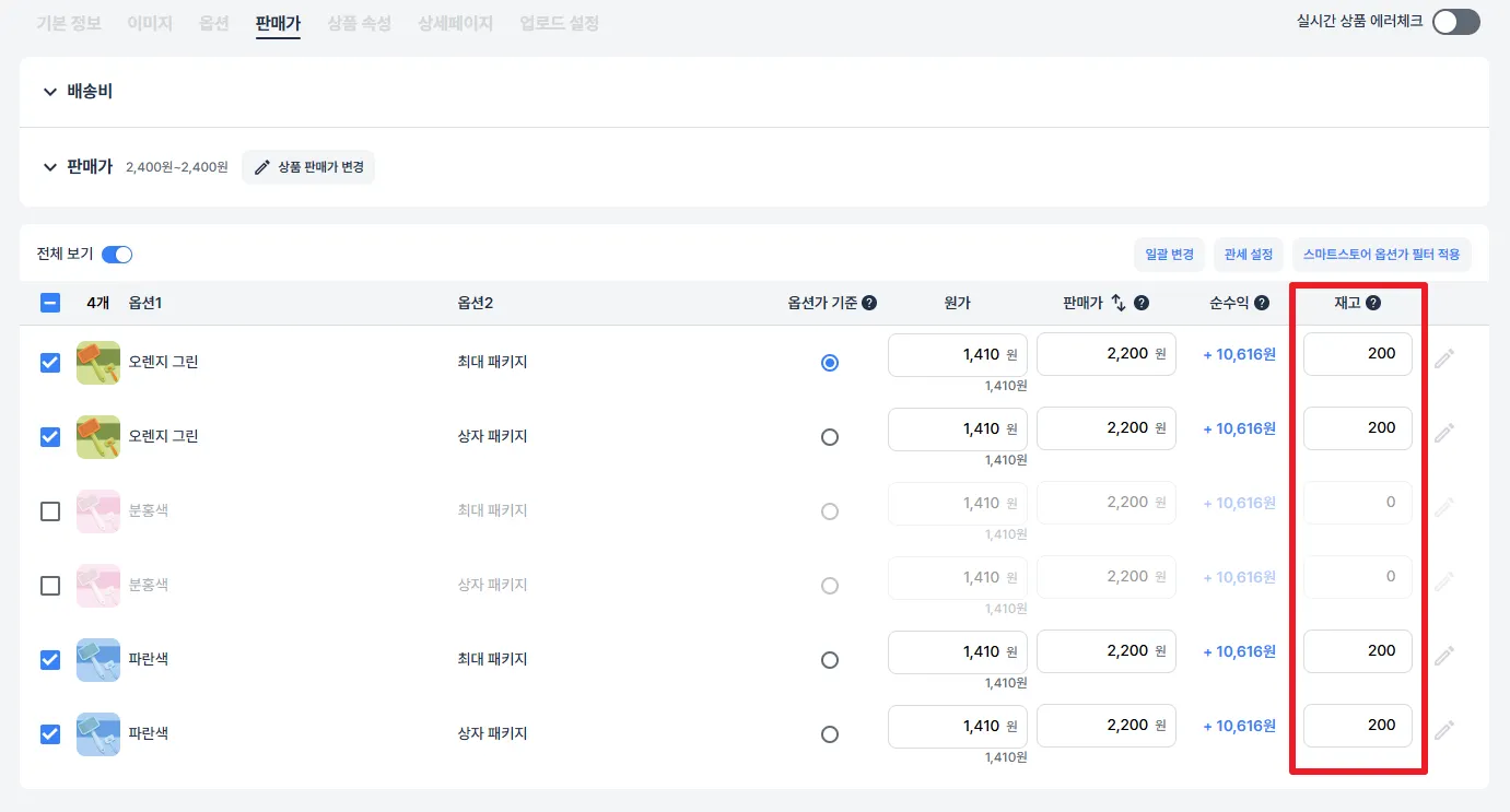 수집상품의 옵션별 재고량을 설정해 둡니다.